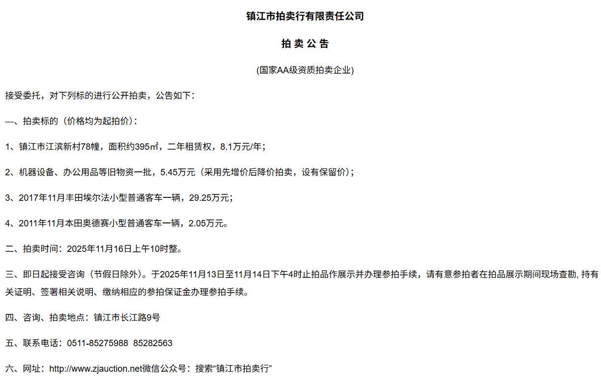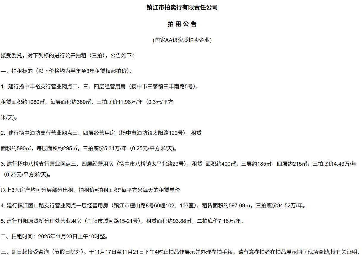 鎮江市拍賣行有限責任公司拍 租 公 吿(國家AA級資質拍賣企業)接受委托,對下列標的進行公開拍租(三拍),公告如下:—、拍租標的(以下價格均為半年至3年租賃權起拍價):1.  建行揚中豐裕支行營業網點二、三、四層經營用房(揚中市三茅鎮三豐南路5號),租賃面積約1080㎡,每層面積約360㎡,三拍底價11.98萬/年(0.3元/平方米/天)。2.  建行揚中油坊支行營業網點三、四層經營用房(揚中市油坊鎮太陽路129號),租賃面積約590㎡,每層面積約295㎡,三拍底價5.34萬/年(0.25元/平方米/天)。3. 建行揚中八橋支行營業網點三、四層經營用房(揚中市八橋鎮太平北路29號),租賃  面積約400㎡,三層約185㎡,四層約215㎡,三拍底價4.43萬/年(0.25元/平方米/天)。以上3套房產均可分層部分出租,拍租價=拍租面積*每平方米每天的租賃單價4. 建行鎮江團山路支行營業網點一層經營用房(鎮江市檀山路8號60幢102、103室),租賃面積約597.09㎡,三拍底價34.52萬/年。5. 建行丹陽原賢橋分理處營業用房(丹陽市城河路15-21號),租賃面積約93.88㎡,二拍底價7.16萬/年。二、拍租時間:2025年11月23日上午10時整。三、即日起接受咨詢(節假日除外)。于11月17日至11月21日下午4時止拍品作展示并辦理參拍手續,請有意參拍者在拍品展示期間現場查勘,持有關證明、簽署相關說明、繳納相應的參拍保證金辦理參拍手續。四、咨詢、拍租地點:鎮江市長江路9號五、聯系方式:0511-85275988   13655299933楊先生六、網址:http://www_zjauction_net.666cs.com.cn;微信公眾號:搜索“鎮江市拍賣行” 拍品清單2025.11.23序號名稱起拍價(元)標的說明1建行揚中豐裕支行營業網點二、三、四層經營用房(揚中市三茅鎮三豐南路5號),租賃面積約1080㎡,每層面積約360㎡三拍底價11.98萬/年(0.3元/平方米/天)1、1-3號房產均可分層部分出租,拍租價=拍租面積*每平方米每天的租賃單價;2、意向競拍人在拍賣前需持營業執照或身份證與委托方說明租賃房產經營業態,確定意向后出具房產承租用途承諾書,經委托方審核后,方可交納保證金參加競拍;3、租賃期限為半年至3年(承租方與出租方協商而定),承租方每半年或一年結付租金,租賃期間的水、電費用及其它相關費用均由承租方承擔;4、承租方不得用于經營和保管危險物品,不得用于開設餐飲、娛樂等可能嚴重影響消防安全、運營安全的經營業態,不得用于經營委托貸款、小額貸款等可能冒用委托方名義,帶來聲譽風險的經營業態。租賃期內,承租方不得破壞墻體結構,自行成就消防、安全等使用條件,不得擅自將租賃房屋轉租、轉讓給他人使用,否則委托方有權收回房屋;5、拍租成交后,承租方將租金交至出租方指定賬戶,傭金交至拍賣方賬戶(拍租傭金為該房屋一個月租金)。承租方憑租賃合同無息退還保證金。2建行揚中油坊支行營業網點三、四層經營用房(揚中市油坊鎮太陽路129號),租賃面積約590㎡,每層面積約295㎡三拍底價5.34萬/年(0.25元/平方米/天)3建行揚中八橋支行營業網點三、四層經營用房(揚中市八橋鎮太平北路29號),租賃面積約490㎡,每層面積約245㎡三拍底價4.43萬/年(0.25元/平方米/天)4建行鎮江團山路支行營業網點一層經營用房(鎮江市檀山路8號60幢102、103室),建筑面積約597.09㎡三拍底價34.52萬/年5建行丹陽原賢橋分理處營業用房(丹陽市城河路15-21號),建筑面積約93.88㎡二拍底價7.16萬/年